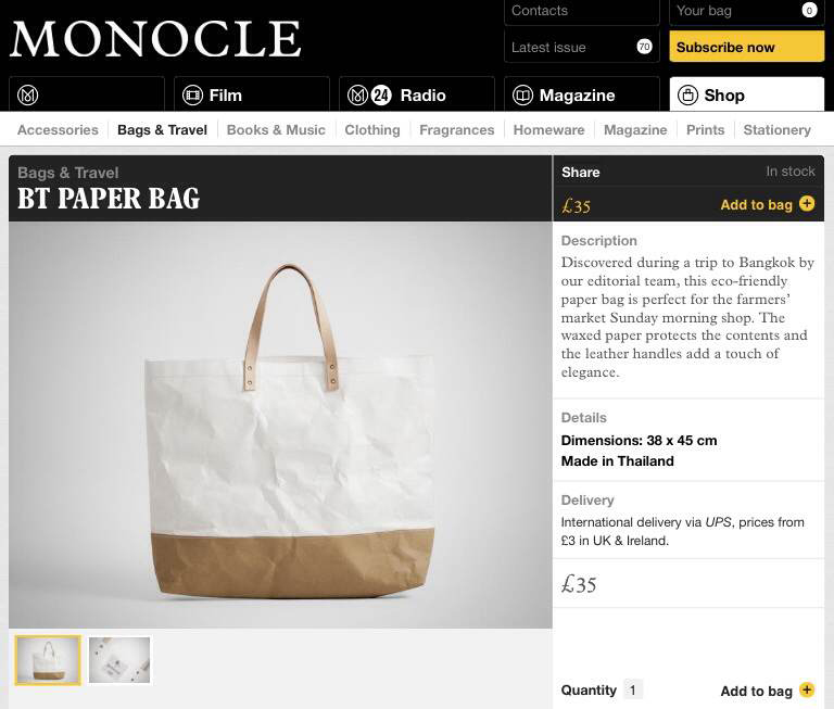 - Shopping bag long: Brown, Black - Tote bag long: Brown, Black - Travel Pouch A5: Brown, Black ![]() BelltaStudio x Monocle Collaboration 2014